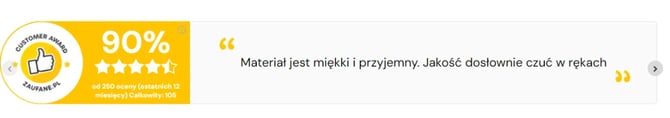 - Widgety statyczne: Stałe elementy umieszczane np. w nagłówku, stopce lub innym wybranym miejscu strony. Zwykle pokazują podsumowanie opinii o sprzedawcy – np. średnią ocenę i łączną liczbę opinii (często wraz z odznaką Zaufane.pl Customer Award). Te widgety są subtelne i nie zajmują dużo miejsca, dlatego zaleca się ich obecność na wszystkich podstronach (zwłaszcza na stronie głównej). Kliknięcie statycznego widgetu zazwyczaj przekierowuje użytkownika do certyfikatu Zaufane.pl z pełnym zestawieniem opinii.