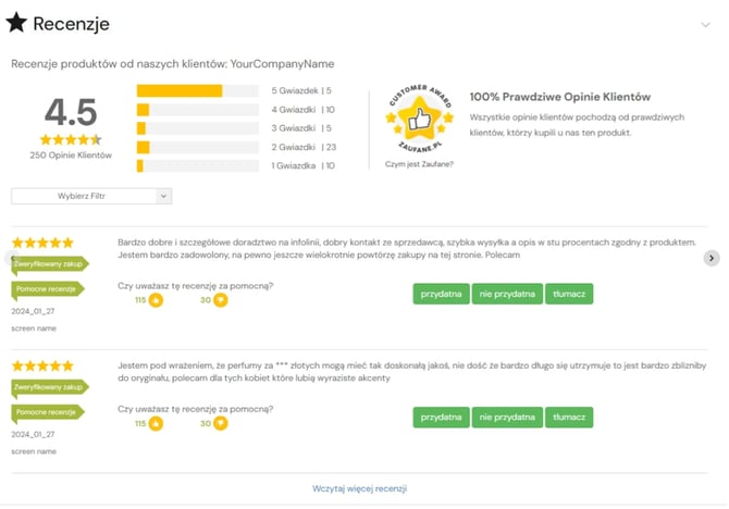 - Widgety produktowe: Te widgety służą do wyświetlania opinii o konkretnych produktach na kartach produktów w sklepie internetowym. Zintegrowany widget produktowy pokaże np. ocenę w postaci gwiazdek przy produkcie oraz listę recenzji danego artykułu (często tuż pod opisem produktu). Pomaga to klientom w podjęciu decyzji zakupowej na podstawie doświadczeń innych kupujących. Według zaleceń, warto zgromadzić przynajmniej 20–30 opinii na każdy produkt – już około 20 pozytywnych recenzji na karcie produktu może zwiększyć sprzedaż tego produktu o 100%, a przy 100+ recenzjach nawet o 380%.