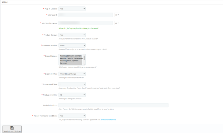 “Exclude Products” Jeśli nie chcesz zbierać opinii dla konkretnych produktów – wpisz ich identyfikatory (oddzielone przecinkami) w odpowiednim polu. Pole „Accept Terms and Conditions” powinno mieć wartość „yes”.