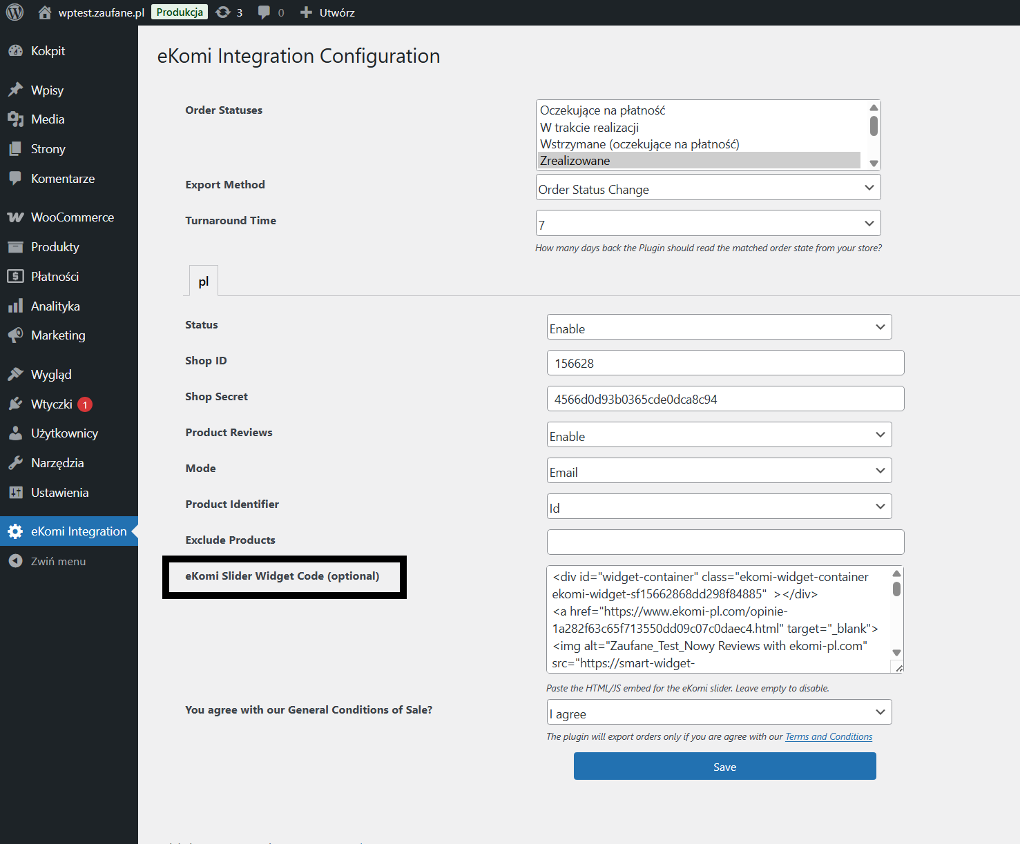 Aby prezentować opinie o sprzedawcy należy tyko w konfiguracji wtyczki w polu: eKomi Slider Widget Code (optional) wstawić kod widgetu, który dostarczy opiekun klienta. A następnie zapisać zmiany za pomocą przycisku Save.