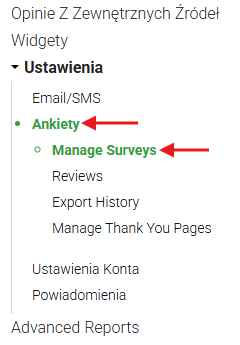 1. Należy zalogować się dostępami do panelu zaufane.pl. Następnie wejść w zakładkę Ankiety → Manage Surveys :