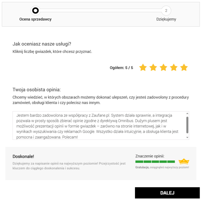 Dzięki temu klient na bieżąco widzi, jak jego opinia staje się coraz bardziej wartościowa – co naturalnie motywuje go do napisania dłuższego, bardziej przemyślanego komentarza.