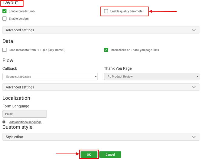 5. Pod Layout należy zaznaczyć opcję Enable quality barometr i przycisk OK na dole: