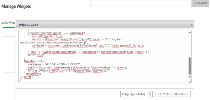 - Copy to Clipboard (Kopiuj kod) – kopiuje do schowka kod JavaScript widżetu potrzebny do osadzenia go na stronie sklepu. Dzięki temu możesz szybko przekazać kod swojemu zespołowi IT lub wkleić go samodzielnie w odpowiednie miejsce na stronie. Rozwiązanie to przyspiesza proces wdrożenia – nie musisz za każdym razem generować kodu od nowa, wystarczy jedno kliknięcie i kod jest gotowy do użycia.