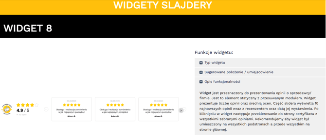 - Widżety sprzedawcy – czyli widgety prezentujące opinie o całym Twoim sklepie lub firmie. Tych widżetów jest łącznie 15 i dodatkowo dzielą się na podtypy, takie jak: widżety statyczne, widżety pływające, widżety typu slider (przewijane), slidery statyczne, a także specjalne widgety typu Showroom i Agregacyjny.