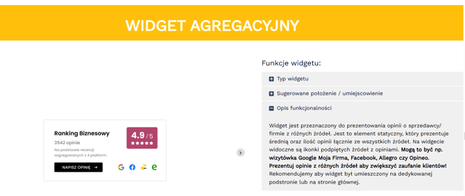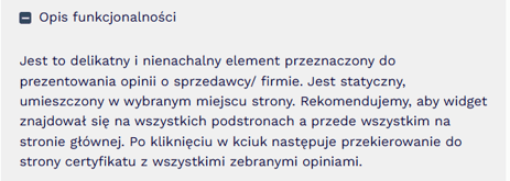 - Opis i typ widżetu – krótka charakterystyka wyjaśniająca, z jakim rodzajem widżetu masz do czynienia. Opis wskazuje, czy jest to widżet sprzedawcy (opinie o sklepie jako całości) czy produktowy (opinie o produkcie), a także zawiera ogólne informacje o tym, co widżet wyświetla.
